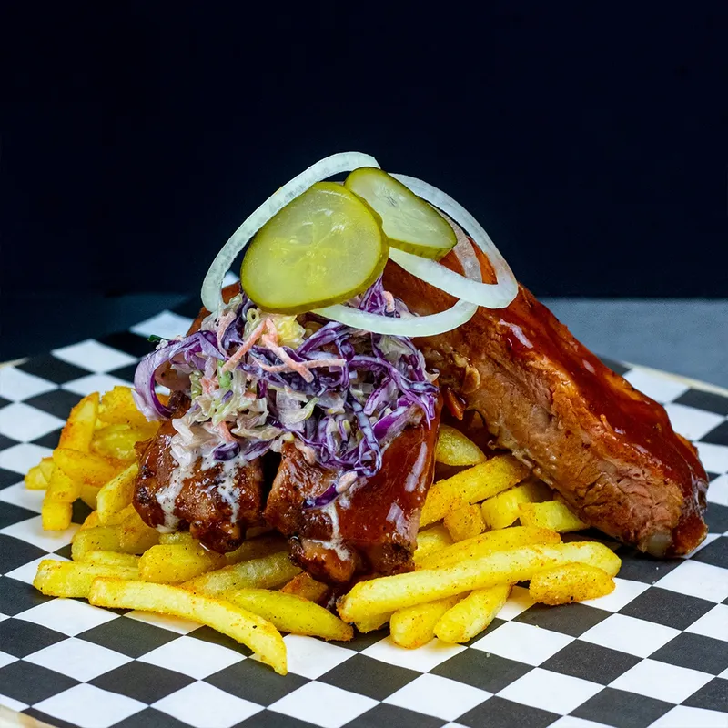 En pan brioche tostado con mantequilla, nuestra coleslaw con receta americana, aros de cebolla morada fresca, queso cheddar y mostaza de peras confitadas. Incluye porción de papas fritas.