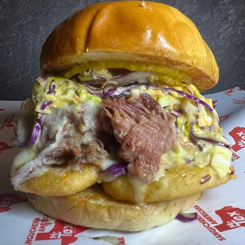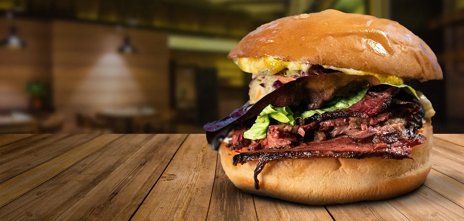 Sandwich en pan brioche tostado con mantequilla, mostaza de peras confitadas, aros de cebolla morada fresca, lechuga, pepinillo dulce, coleslaw y mayo ciboulette. Incluye porción de papas fritas.